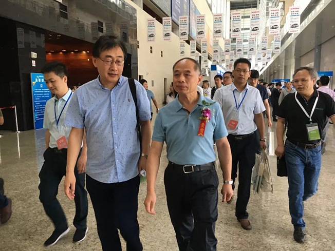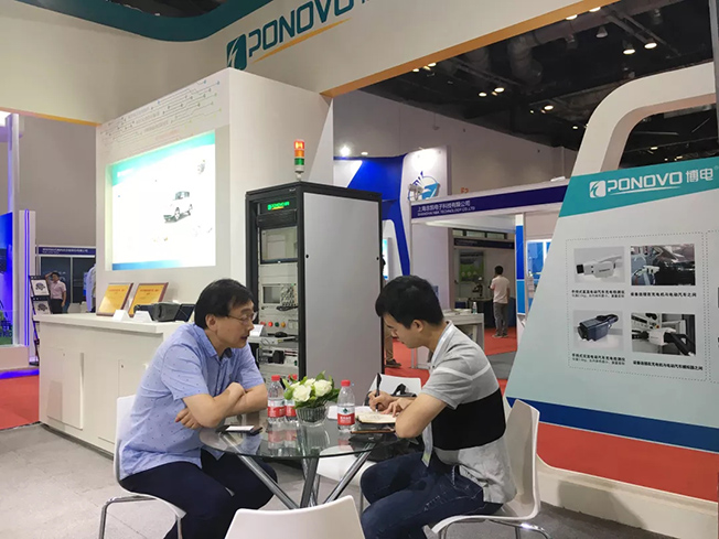 開幕儀式之后,博電科技董事長陳衛(wèi)陪同國網(wǎng)電動汽車服務有限公司副總經(jīng)理賈俊國步入會場,進行參觀。