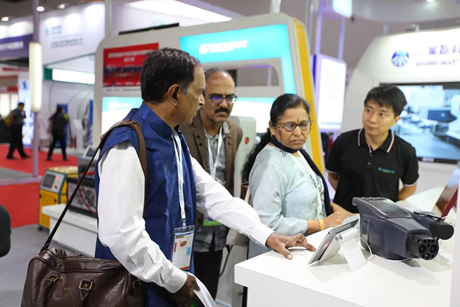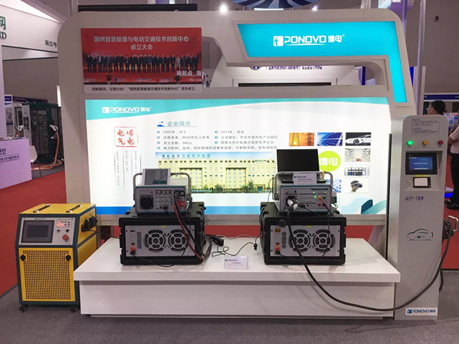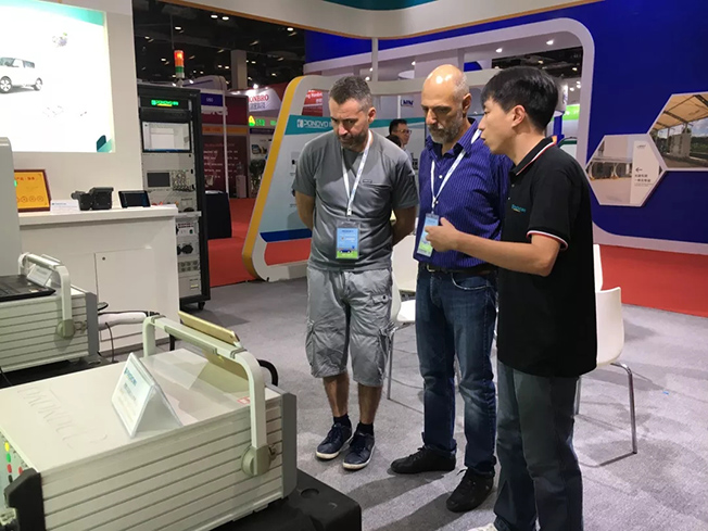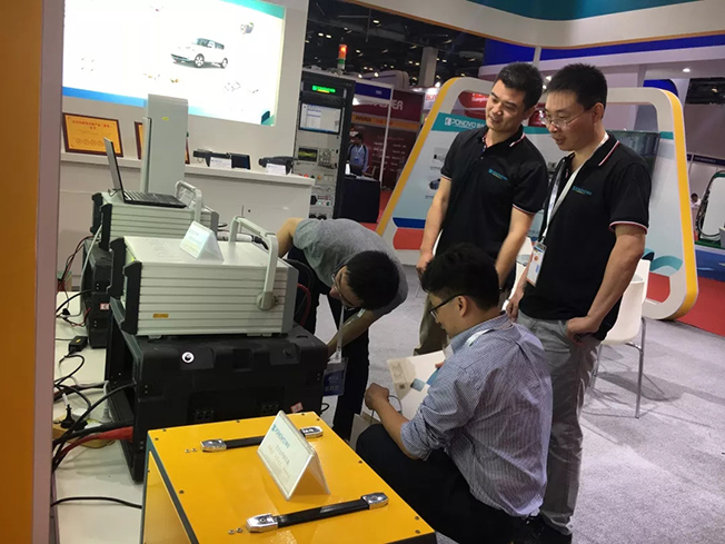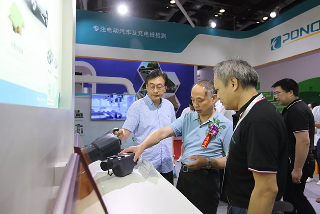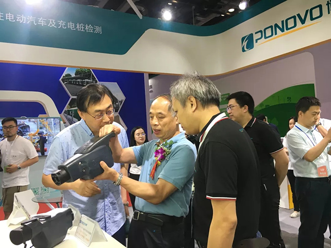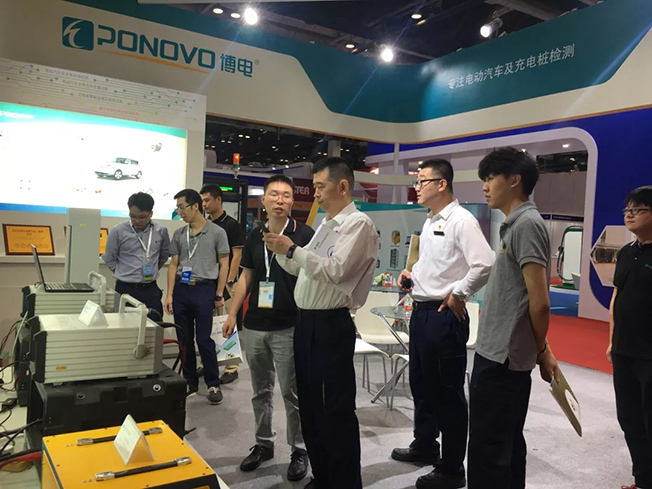 賈總和陳總參觀擺放在國網(wǎng)電動汽車服務有限公司展臺的配套測試設備——博電充電樁巡檢儀。