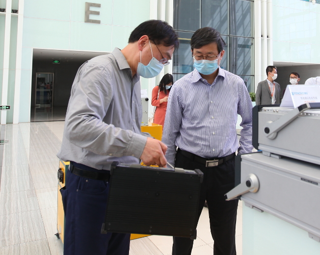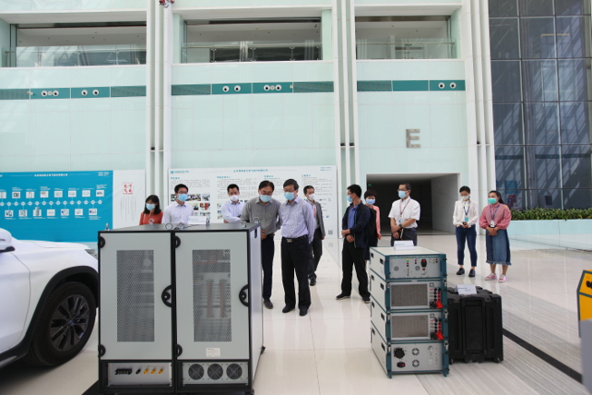 ▲聯(lián)研院領(lǐng)導(dǎo)參觀博電EVD200直流充電設(shè)施現(xiàn)場檢測裝置