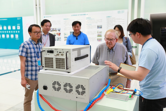 ▲Burke博士一行參觀博電與美國NI合作研發(fā)的模塊化功率測試平臺