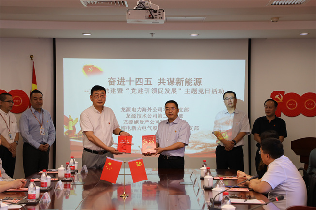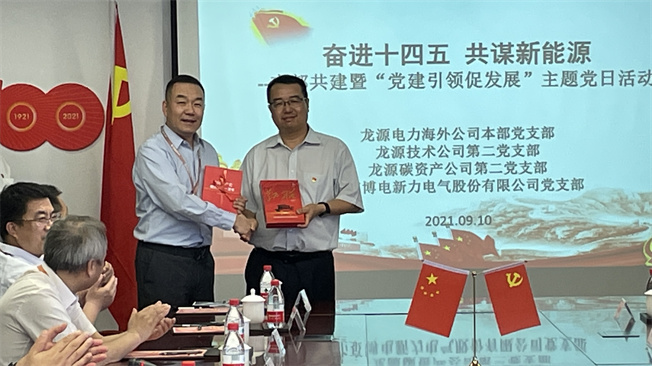 ▲北京博電新力電氣股份有限公司副總經理薛彥東與龍源(北京)碳資產管理技術有限公司黨委副書記、總經理祝亮互贈書籍隨后,各方就黨建工作“組織共建、隊伍共抓、陣地共用、發(fā)展共謀”達成共識,四個支部簽署了支部共建協(xié)議書。