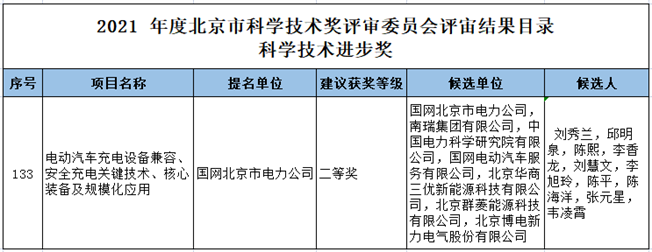 近日,北京市人民政府網(wǎng)站公布《北京市人民政府關(guān)于2021年度北京市科學(xué)技術(shù)獎勵的決定》,由北京博電新力電氣股份有限公司、國網(wǎng)北京市電力公司、南瑞集團有限公司、中國電力科學(xué)研究院有限公司、國網(wǎng)電動汽車服務(wù)有限公司等單位聯(lián)合申報的《電動汽車充電設(shè)備兼容、安全充電關(guān)鍵技術(shù)、核心裝備及規(guī)模化應(yīng)用》,榮獲2021年度北京市科學(xué)技術(shù)獎——科學(xué)技術(shù)進步獎二等獎。