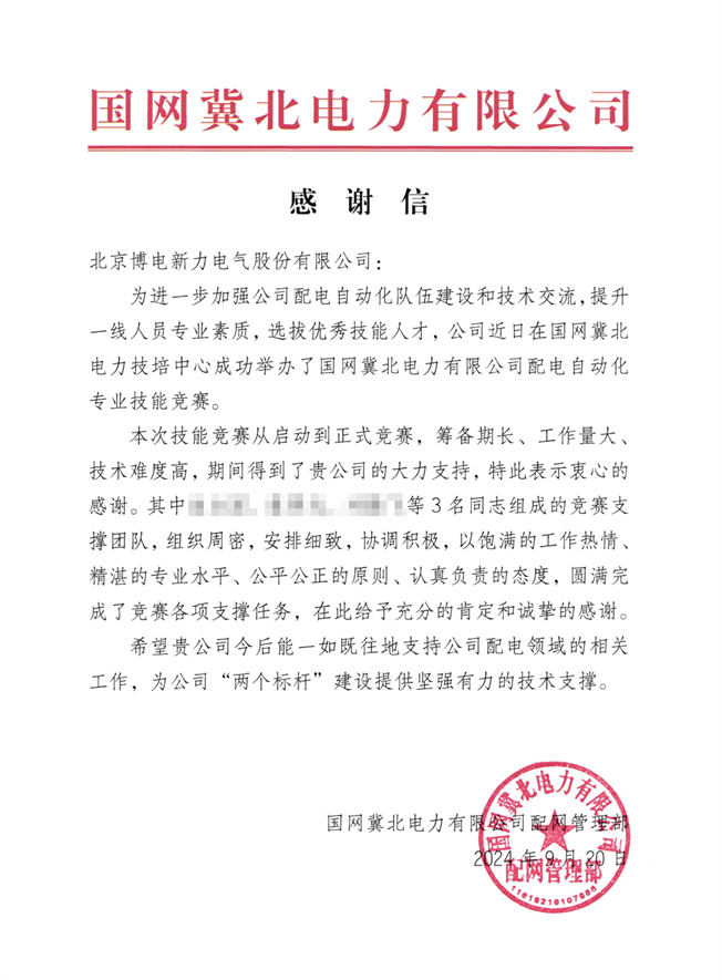 近日,北京博電新力電氣股份有限公司(簡(jiǎn)稱“博電科技”)陸續(xù)收到國(guó)能(綏中)發(fā)電有限責(zé)任公司和國(guó)網(wǎng)冀北電力有限公司配網(wǎng)管理部發(fā)來(lái)的感謝信。兩封感謝信均高度評(píng)價(jià)了博電科技在保障電力系統(tǒng)相關(guān)技能競(jìng)賽中發(fā)揮的重要作用。